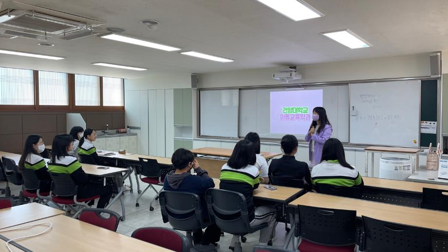 아동교육학과에서는 충남교육연구정보원과 함께 충남지역 고교생을 대상으로 하는 진로체험 프로그램을 운영하고 있습니다. 5.10(수)에 공주여자고등학교 학생들을 대상으로 <예비 영유아 아동교사의 예술교육 체험>을 진행하였습니다. 건양대학교 아동교육학과에 많은 관심과 성원을 부탁드립니다.