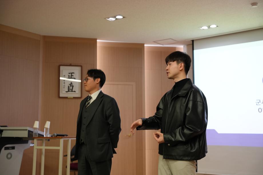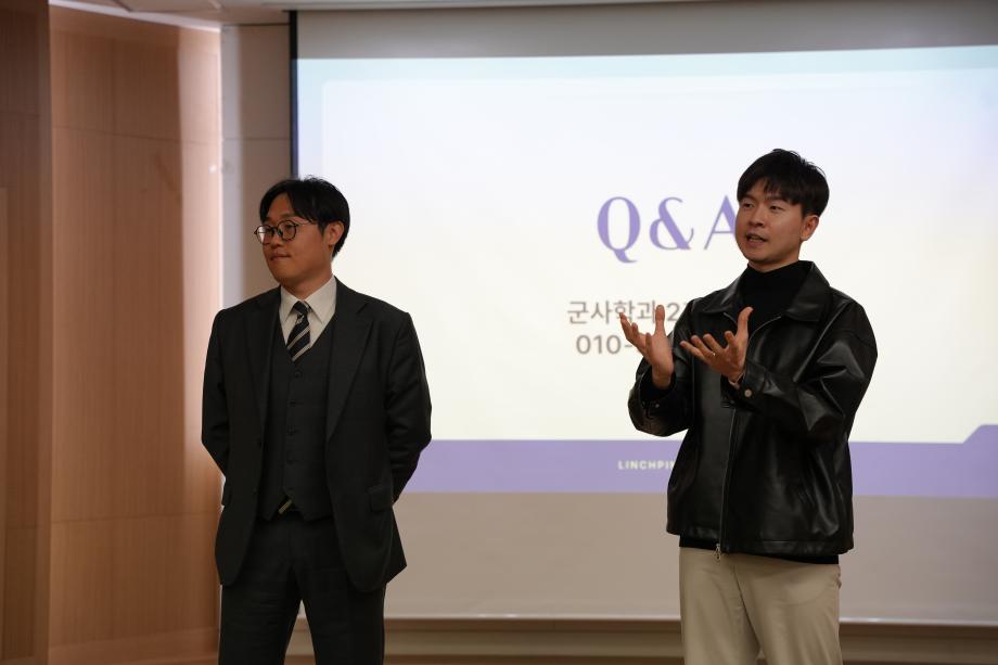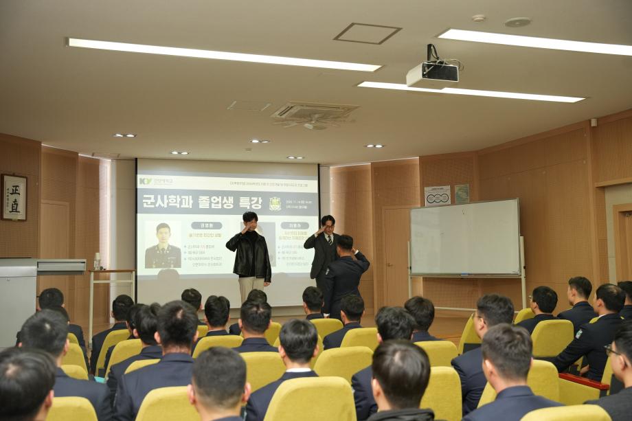 - 강사 : ① 군사학과 1기 졸업생 예)육군대위 권영환 / 주식회사 오팬하우스 파트장 ② 군사학과 2기 졸업생 예)육군대위 이종하 / 인카금융서비스 린치핀사업단 팀장 |