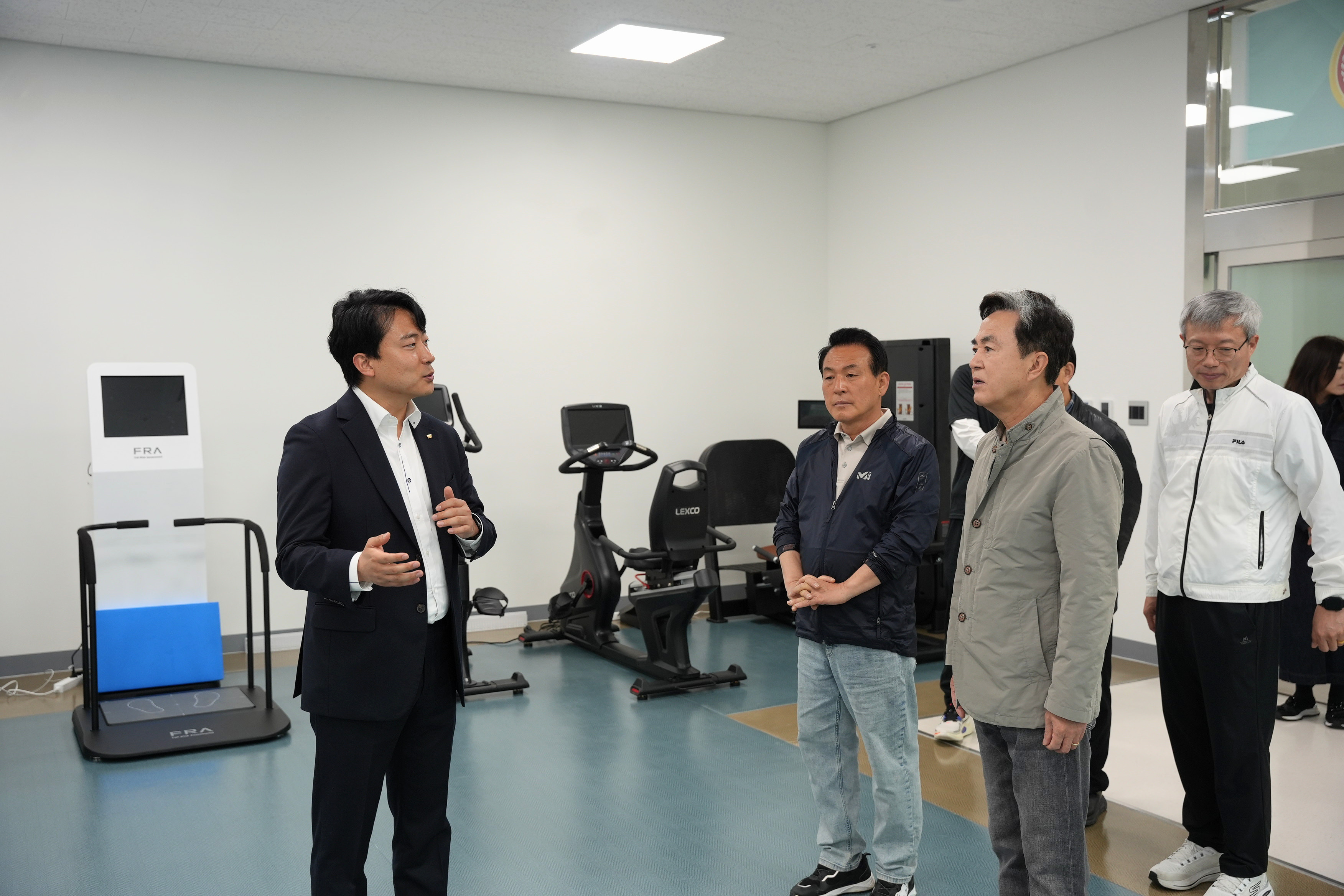 ■ ‘국민체력100’ 사업 선정... 지역민 건강 책임지는 거점 역할 수행 먼저 대학 내 근골격계질환 예방운동지원센터를 방문해 ‘국민체력100 인증센터’ 선정 관련 성과 보고를 받았다. 국민체력100 사업은 국민의 체력 상태를 과학적으로 측정하고 맞춤형 운동 처방을 제공하는 국가 스포츠 복지 서비스다. 김태흠 도지사는 사업 추진 현황을 보고받은 뒤 “대학의 전문 인프라가 지역민의 건강 증진으로 직접 연결되는 훌륭한 모델”이라며 “건양대가 지역 사회의 체육 복지 거점으로서 중추적인 역할을 해달라”고 당부했다.