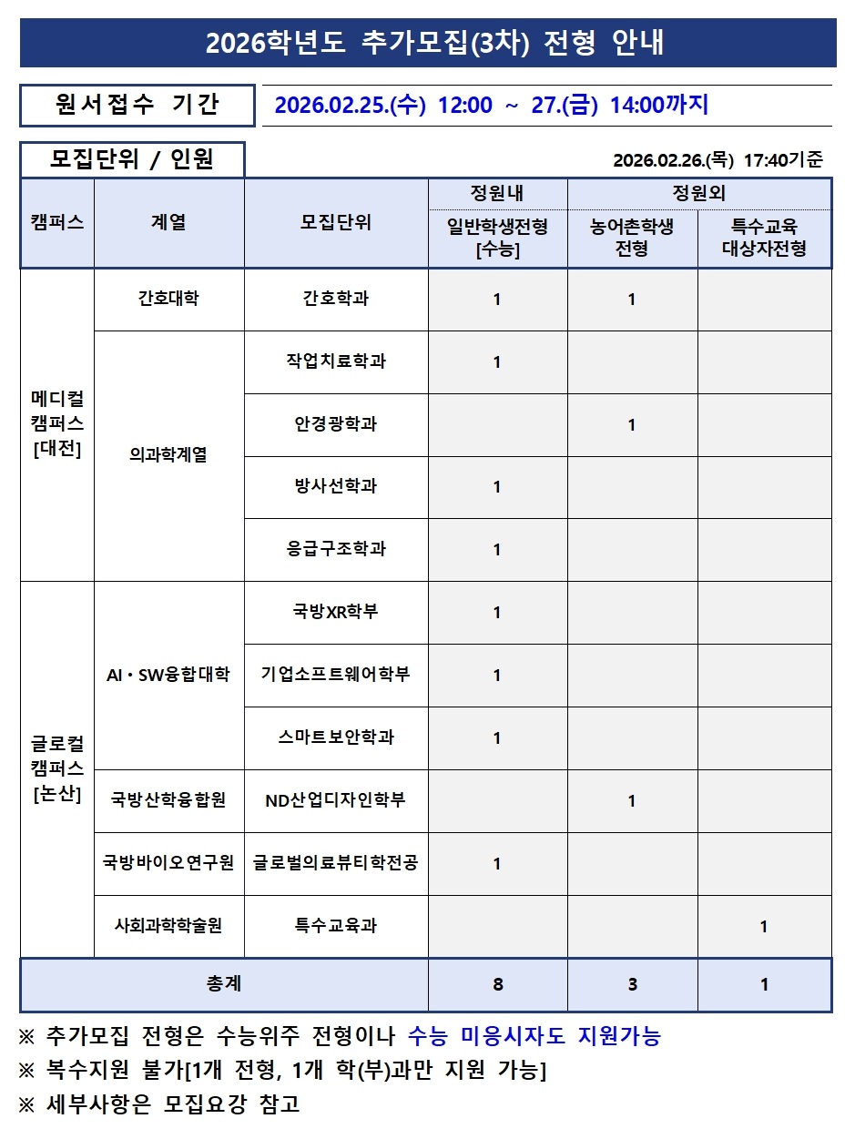 | 제목 | 2026학년도 추가모집(3차) 모집요강 탑재 안내(2026.02.26) 이월반영 10차변동 | ||||