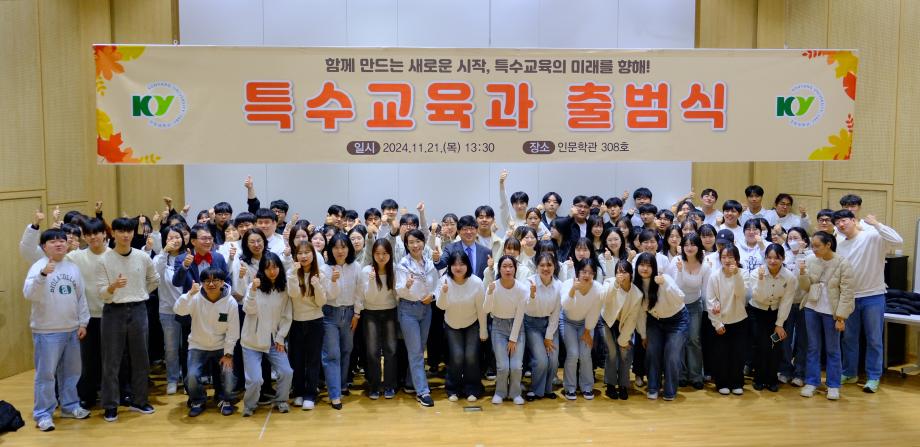 건양대 특수교육과, 새로운 도약 위한 출범식 건양대학교(총장 김용하)가 21일 기존의 초등특수교육과와 중등특수교육과를 통합하여 특수교육과로 새출발을 하는 출범식을 개최했다. 이날 출범식을 통해 특수교육과는 ‘학생의 참(CHARM)ing 성장을 주도하는 특수교육 전문가’라는 비전 선포 및 이날 참가자들을 대상으로 학과 통합의 배경 및 향후 발전 계획에 대한 설명이 이뤄졌다. 이날 출범식과 함께 예비특수교사들의 수업 운영 역량을 뽐낼 수 있는 수업실연 경진대회와 현장 전문가를 초청한 ‘특수교육대상학생을 위한 AI 코스웨어 융합교육 사례’ 특강도 진행됐다. 특수교육과 준비학과장인 이필상 교수는 “우리 건양대 특수교육과는 참교육을 실천하면서 세상을 따뜻하게 밝히는 특수교육 전문가를 양성하는 학과”라며 “우리 학과는 교사 자격증을 초등특수교사와 중등특수교사 복수 자격 취득을 전면 허용해 학생들의 선택권을 확대할 것”이라고 밝혔다. 이날 행사에 참여한 건양대 김대권 교무처장은 “초등특수교육과와 중등특수교육과는 그동안 높은 특수교사 임용시험 합격률을 자랑하는 등 경쟁력을 갖춘 훌륭한 학과로 통합의 시너지 효과를 통해 학생들이 더욱 만족하는 학과가 될 것으로 기대한다”고 말했다. a |